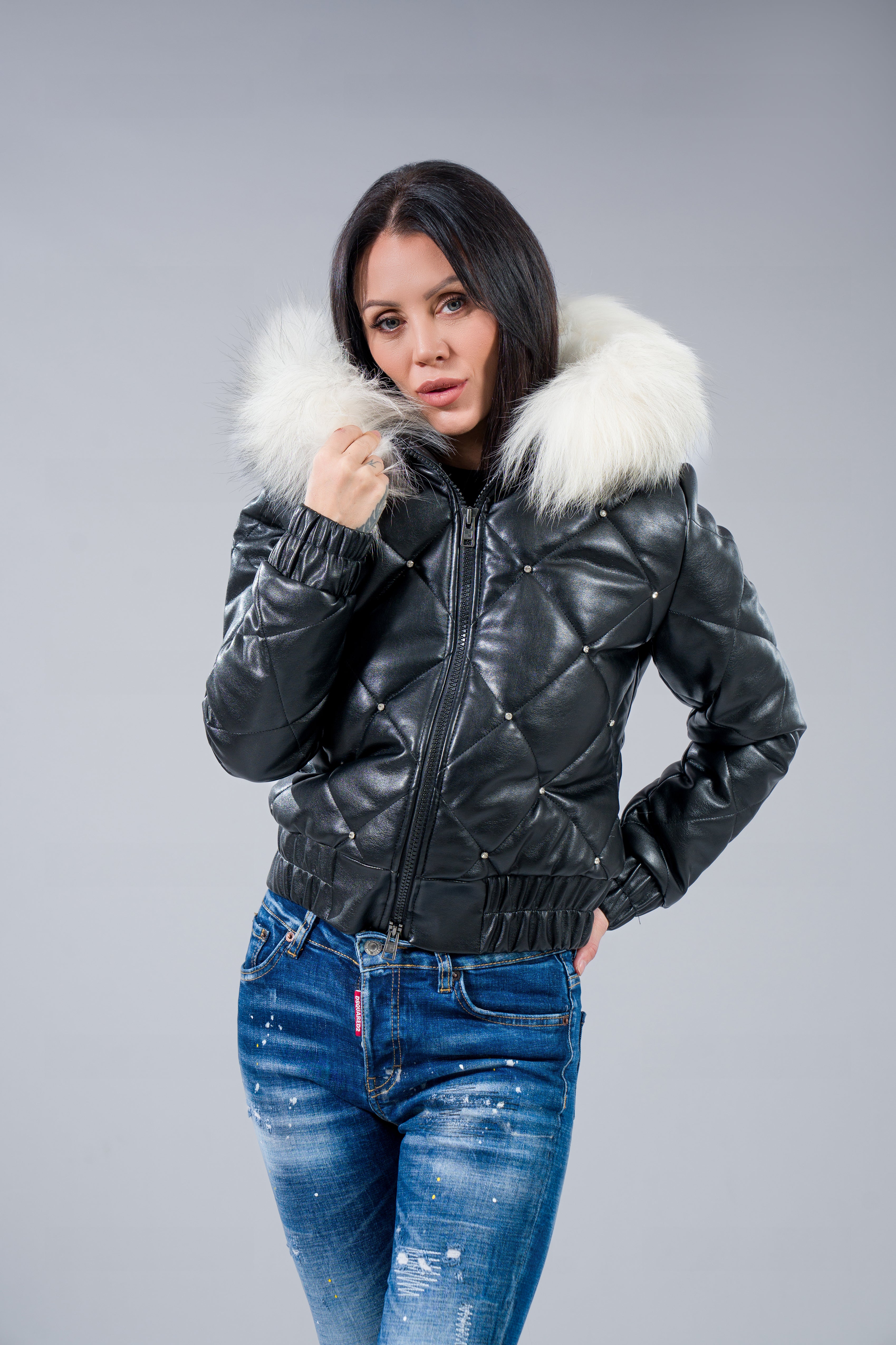 Дамско зимно яке от черна велурена еко кожа и черна промазка